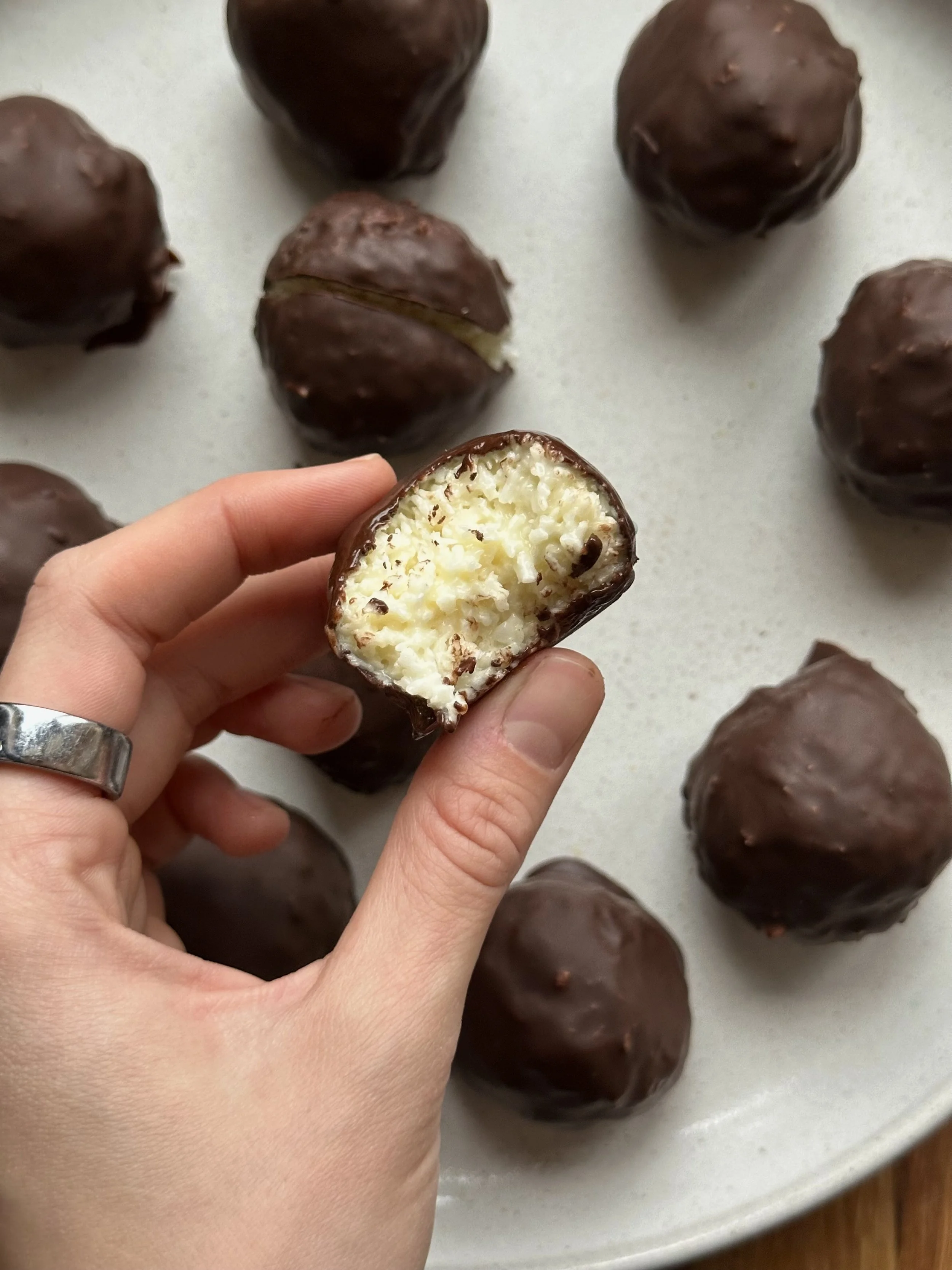 Kokoso drožles sumaišom su kondensuotu pienu, susukam į rutuliukus, dedam į šaldiklį ~10min. Per tą laiką išsitirpinam šokoladą (jei šokoladas labai tirštas, galima įmaišyti šaukštelį kokosų aliejaus). Rutuliukus panardinu į šokoladą, dedu į šaldytuvą, kol sustingsta.