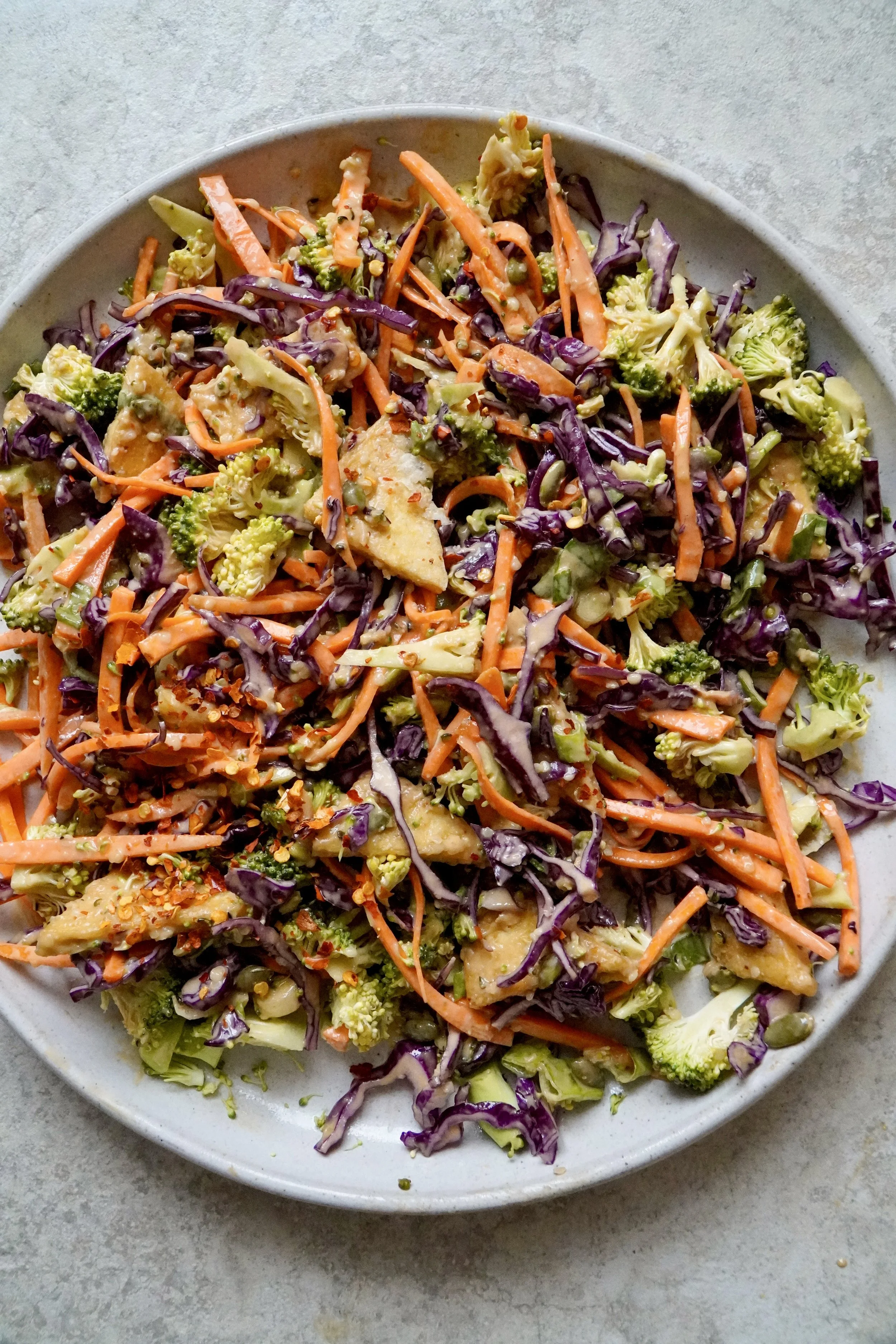 Morką, kopūstą, brokolį, laiškinį svogūną susmulkinu ir dedu į lėkštę kartu su keptu tofu, moliūgų sėklomis (jas prieš tai šiek tiek paskrudinu sausoje keptuvėje) ir kanapių sėklomis.