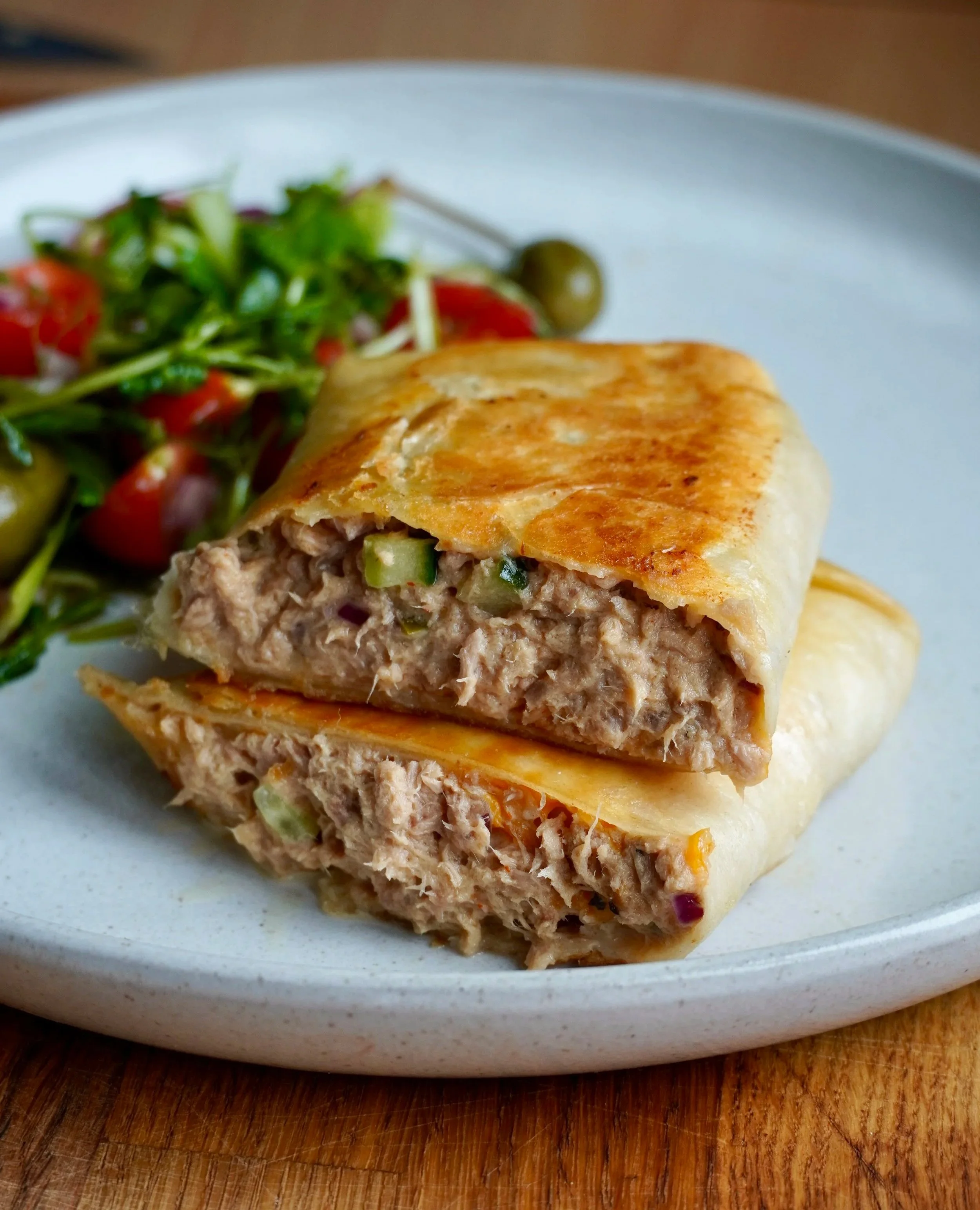 Dubenėlyje sumaišau tuną, smulkintą svogūną, agurką, jalapenus, majonezą, garstyčias, srirachą, druską ir pipirus. Į tortiliją dedu ~3 šaukštus įdaro, pabarstau sūrio, užlankstau ir kepu keptuvėje iš abiejų pusių. Patiekiu su salotomis.